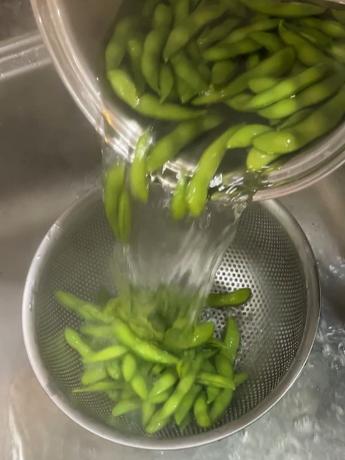 - 찬물에 헹구기 (선택 사항) : 더 푸릇한 색감과 쫄깃한 식감을 원한다면, 삶은 에다마메를 얼음물에 재빨리 헹궈 열기를 식혀줍니다.