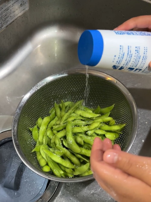 - 세척 및 소금 문지르기 : 에다마메를 흐르는 물에 깨끗이 씻은 후, 소금을 넉넉하게 뿌려 손으로 박박 문질러 주세요. 꼬투리의 털을 제거하고 소금 간이 잘 배게 하는 중요한 과정입니다. (약 3~5분간)